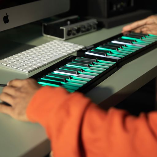 The two versions of LUMI Keys–the Consumer Edition for learning piano and the Studio Edition for producers and performers–offer an entirely new music-making experience with touch-controlled pitch-bend on each of its colorfully illuminated keys. While small enough to fit in a backpack, the LUMI Keys can also double or triple in size by magnetically snapping together.